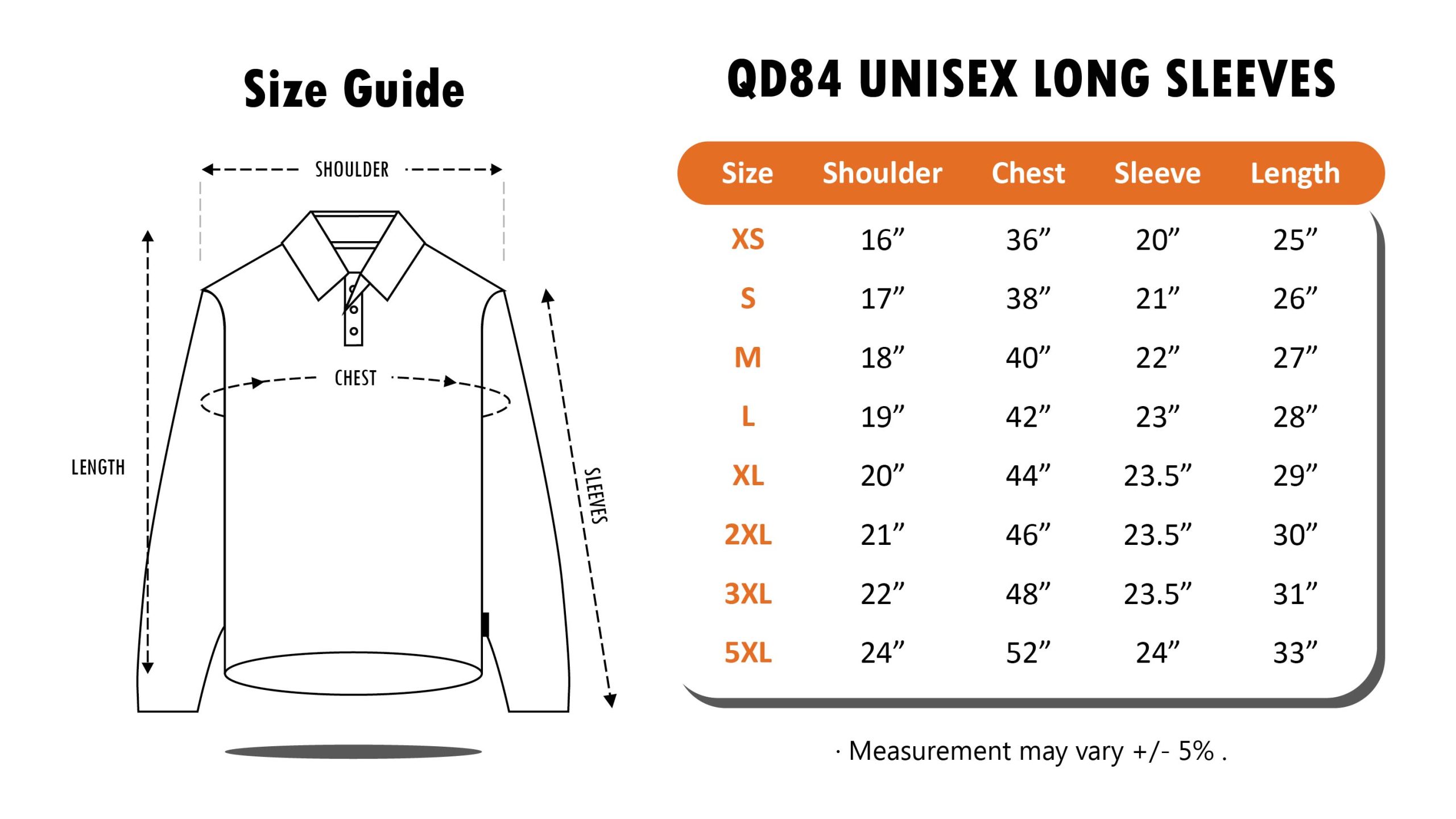 XS, S, M, L, XL, 2XL, 3XL, 5XL